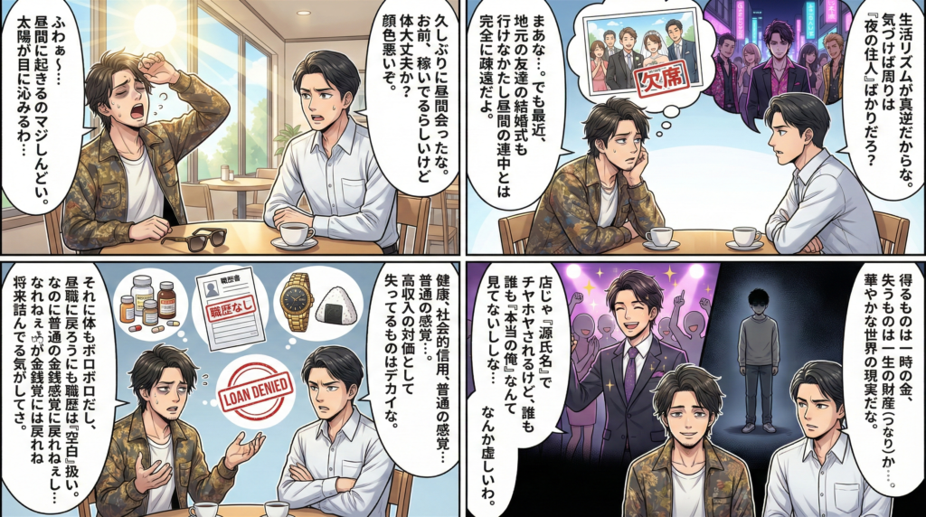 「末路」という言葉はネガティブな響きがありますが、実際には二極化します。成功するパターンでは、稼いだ資金を元手に起業したり、夜の経験で培った対人スキルを活かしてトップセールスマンに転身したりと、豊かな人生を歩みます。一方で、目標を持たずにお金と時間だけを消費してしまった場合、依存症や借金、健康被害に苦しむケースもあります。結局のところ、仕事を通じて「何を積み上げたか」が、その後の人生を決める分岐点となります。