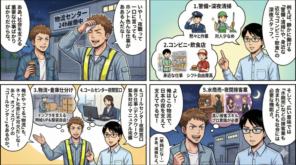 • 夜職: 夜間に働く仕事全般(警備、物流、接客業など)を指す広義の言葉です。